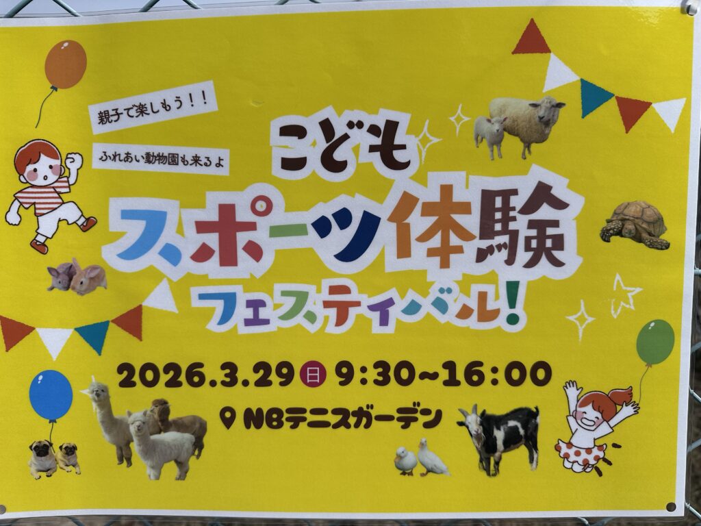 NBテニスガーデン! 2026年3月29日 最終更新日時 : 2026年3月29日 ラブのしっぽの中の人 おはようございます☀ 今日は西区山田町にある【 NBテニスガーデン 】様で開催されている『こどもスポーツ体験フェスティバル』に呼んで頂きました🎾🐕🦺 じゃん‼️ テニス教室をはじめ、ちびっ子が体を動かせるアクティビティがあるイベントみたいです✨ ふれあい移動動物園 さんもある🦙🐐🎵 バルーンアーティスト さんも来てる🎈 なんかすげぇ楽しいぞ✨ ってことで、【 NBテニスガーデン 】様で今日も1日元気に頑張りやす🐕🦺 \ 最新情報をチェック / FacebookXBlueskyHatenaPocketCopy