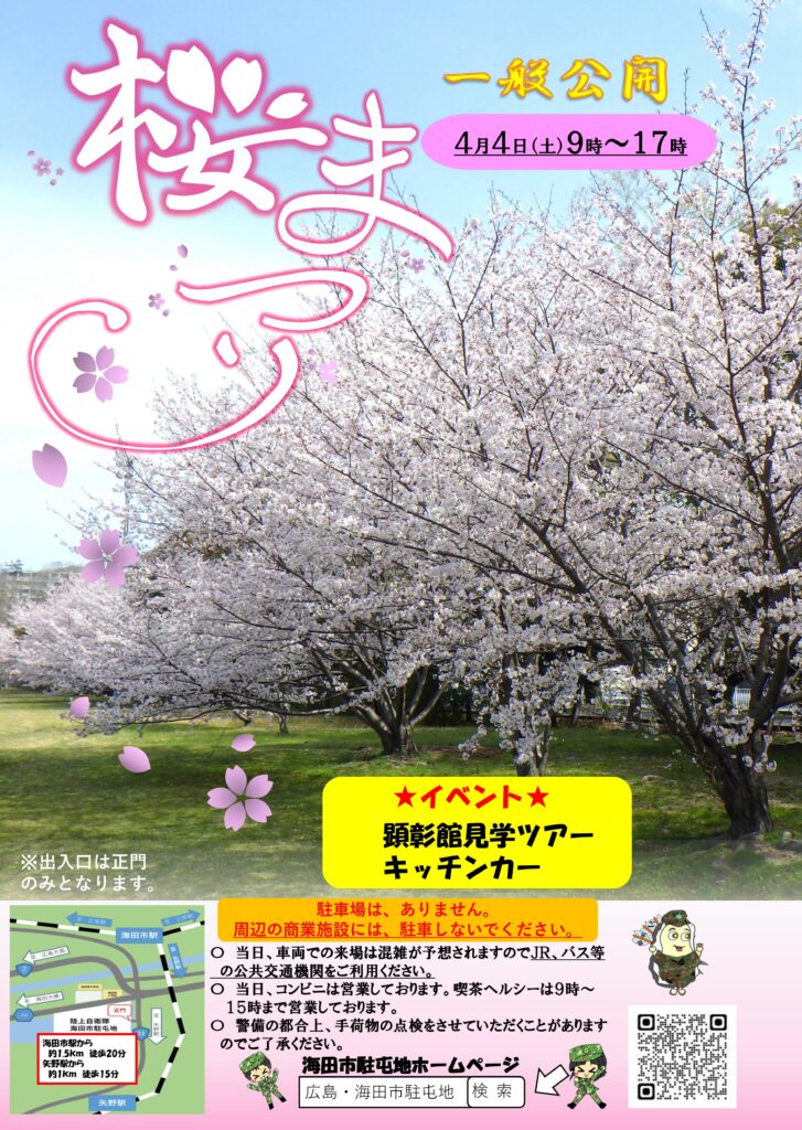 陸上自衛隊海田駐屯地!(桜まつり) 2026年4月4日 最終更新日時 : 2026年4月4日 ラブのしっぽの中の人 おはようございます☂️ 今日は【 陸上自衛隊海田駐屯地 】内で開催されている『桜まつり』に参加させてもらってます🫡 じゃん❗️ こちらですね💡 あいにくの雨ですが… キッチンカーもたくさん✨✨ 普段入ることのできない【 陸上自衛隊海田駐屯地 】内に潜入できる絶好の機会ですよ🎵 この機会にぜひぜひ遊びに来てもらえたらと思います💡 ってことで【 陸上自衛隊海田駐屯地 】様で今日も1日元気に頑張りやす🐕🦺 しっかり焼けました😁 \ 最新情報をチェック / FacebookXBlueskyHatenaPocketCopy